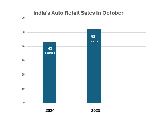 Automobile retail sales rose by a staggering 41% in October 2025 compared to the same period last year, marking the highest level ever recorded. The total vehicle sales crossed 52 lakhs from last year’s 43 lakhs, marking a 21% year-on-year increase1. The surge is fuelled by a robust demand for both passenger vehicles and two-wheelers, due to the GST rate dropping from 28% to 18% in September 2025, making purchases more affordable for first-time buyers and those upgrading their vehicles.