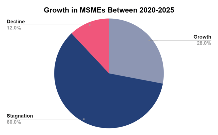 From 2000 to 2025, a meagre 0.4% of micro-enterprises grew into small businesses, and just 0.05% of small companies managed to graduate into the medium enterprise category1. Furthermore, only 28% of Indian MSMEs recorded a CAGR of 5–10% or higher. A majority, nearly 60%, remained stagnant, while about 12% experienced a decline during this period.